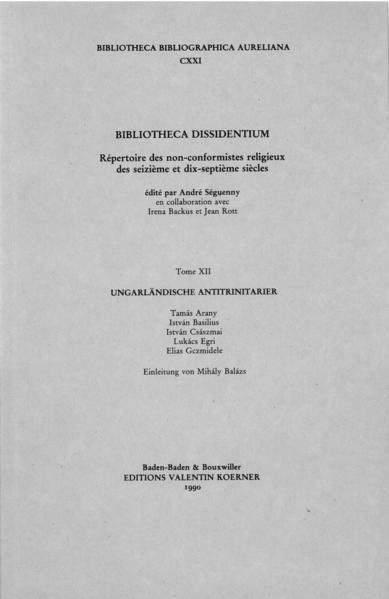Bibliotheca Dissidentium XII Ungarländische Antitrinitarier I: István Basilius, von Mihály Balázs. Tamás Arany, von János Heltai. István Császmai, von János Herner. Lukács Egri, von András Szabó. Elias Gczmidele, von Antal Pirnát