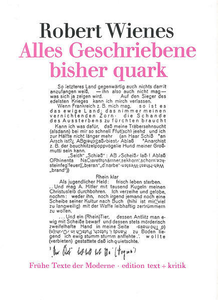 Der Prosatext "Alles Geschriebene bisher quark" ist in nur einem Exemplar erhalten. Das Heft ist durch "Sicherungsverwahrung" bei der Gestapo und später bei der Stasi auf die Nachwelt gekommen und wurde hier erstmals als Faksimile veröffentlicht. Eine gattungsspezifische Einordnung des Textes ist schwierig. Er ist in sechs Kapitel gegliedert, doch sind diese Kapitel gefüllt mit Laut- und Satzfragmentkaskaden, kaum verständlichen Wortspielen, Anagrammen, Verschreibungen und Klangassoziationen. Formale Strukturen verschiedenster Gattungen und Genres lassen sich aufzeigen, intertextuelle Bezüge, die allerdings nur andeutungsweise hergestellt werden, verstärken den Montagecharakter des Textes. Eine narrative Struktur oder diskursive Entwicklung eines Textgeschehens oder einer Handlung ist nicht erkennbar. Seine Sprache enthält Anklänge ans Niederrheinische. Vermutlich hat Robert Wienes, über dessen Biografie nichts weiter bekannt ist, Berufserfahrungen als Setzer oder Buchdrucker gehabt. Als Wortkünstler experimentiert er mit der Sprache ähnlich wie etwa James Joyce, Kurt Schwitters, Otto Nebel oder Arno Schmidt.