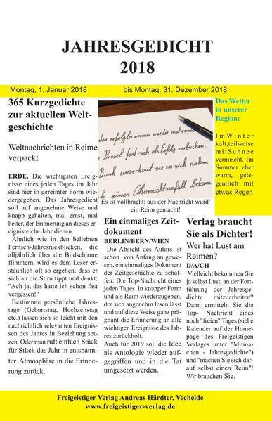 Die wichtigsten Ereignisse eines jeden Tages im Jahr 2018 sind hier in gereimter Form wiedergegeben. Es soll auf angenehme Weise und knapp gehalten, mal ernst, mal heiter, der Erinnerung an dieses ereignisreiche Jahr dienen.
