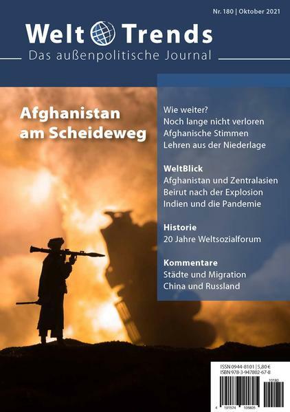 Afghanistan steht im Mittelpunkt dieses Heftes. Im Thema wird das Scheitern des Westens aus deutschen und afghanischen Perspektiven diskutiert. Beiträge dazu von Hans-Joachim Gießmann, Sayed Madadi, Lars Wagner, Theresa Breitmaier, Basir Feda , Winfried Nachtwei. Dies wird durch das Forum und im WeltBlick mit einem Text zu Zentralasien (Hubert Thielicke) ergänzt. Um die Pandemie in Indien geht es in der Analyse von Theresa Zimmermann. Rückblicke gibt es auf Beirut (ein Jahr nach der Explosion) und auf 20 Jahre Weltsozialforum.