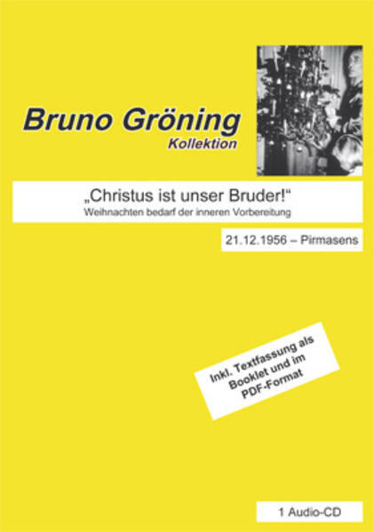 Weihnachtsvortrag, den Bruno Gröning am 21.12.1956 in Pirmasens auf Tonband festgehalten hat. Diese historische Aufnahme mit der originalen Stimme von Bruno Gröning (1906-1959), der als Deutschlands bedeutendster Geistheiler gilt, wurde von der Bruno Gröning Stiftung mithilfe moderner Spezialsoftware klanglich optimiert und für ein angenehmes Hörerlebnis behutsam von Störgeräuschen befreit. Inklusive 28-seitigem Booklet mit der Textfassung der gesprochenen Worte sowie PDF-Datei mit der Abschrift des Vortrags.